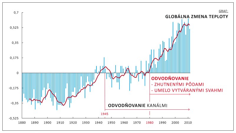 V grafe vidíme, kedy nastalo zvyšovanie globálnych teplôt na našej planéte. Rapídny nárast globálnej teploty nastal práve vtedy, keď sme začali zhutnenou pôdou a umelo vytvorenými svahmi intenzívne odvodňovať našu krajinu. Pôdu hutníme a umelé svahy vytvárame dodnes aj napriek tomu, že už vieme, že sú pre nás obrovskou hrozbou. Prečo?