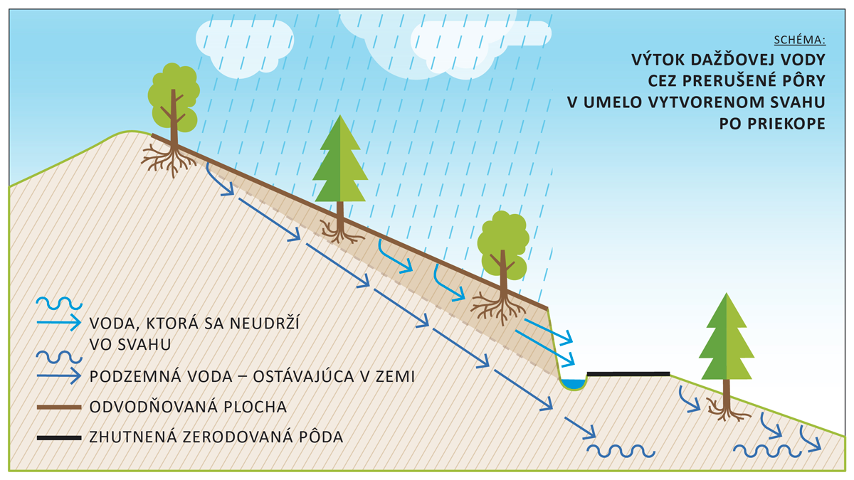 Počas dažďa sa voda dostane cez nezhutnené póry nad umelo vytvoreným svahom do pôdy. Zákonite sa voda začne presúvať do nižších častí svahu až sa napokon dostane k prerušeným pórom v umelo vytvorenom svahu. Z takých pórov voda okamžite odtečie a každá vytečená kvapka bude prírode nad svahom chýbať.